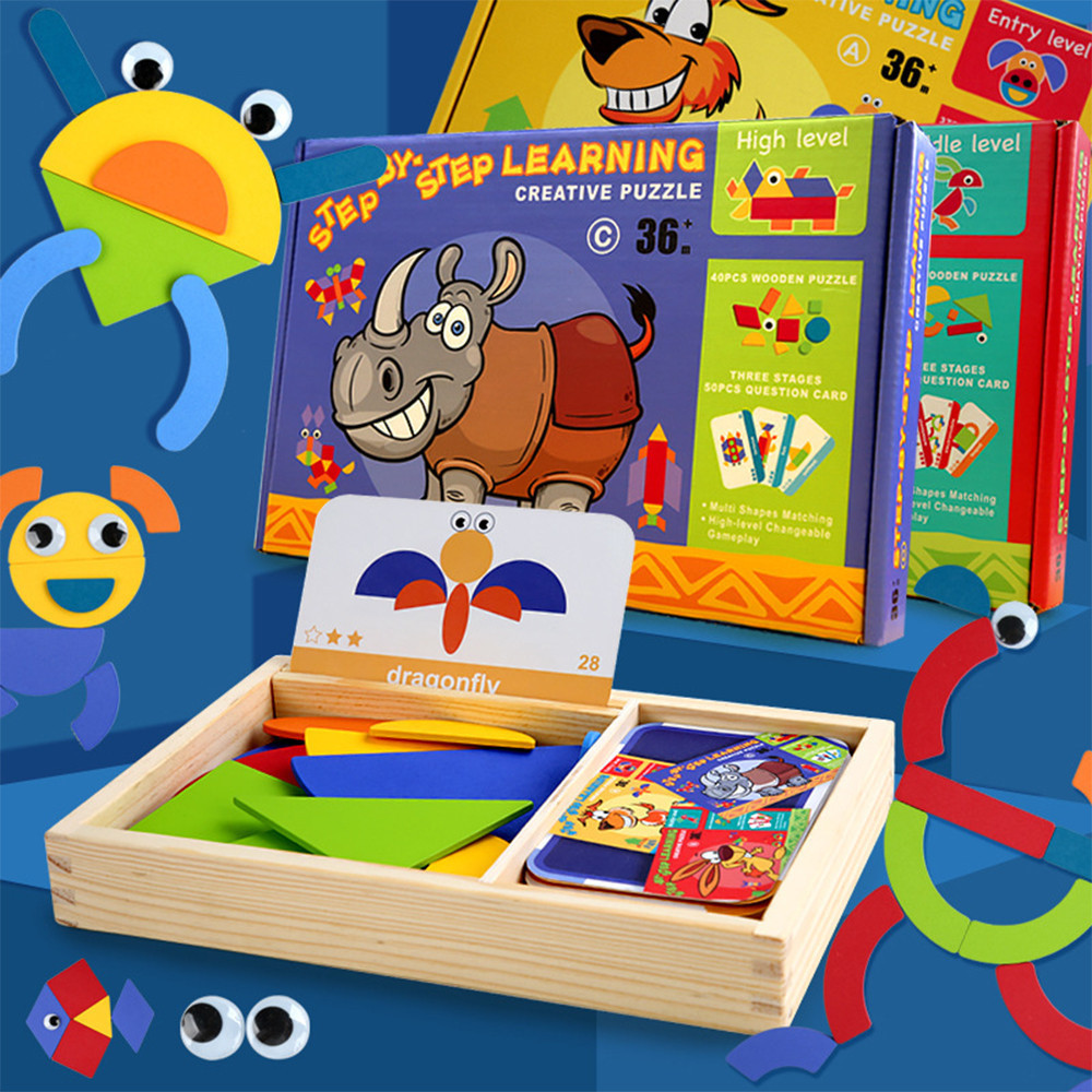 Mágneses tangram fajáték angol kártyákkal, haladó szint