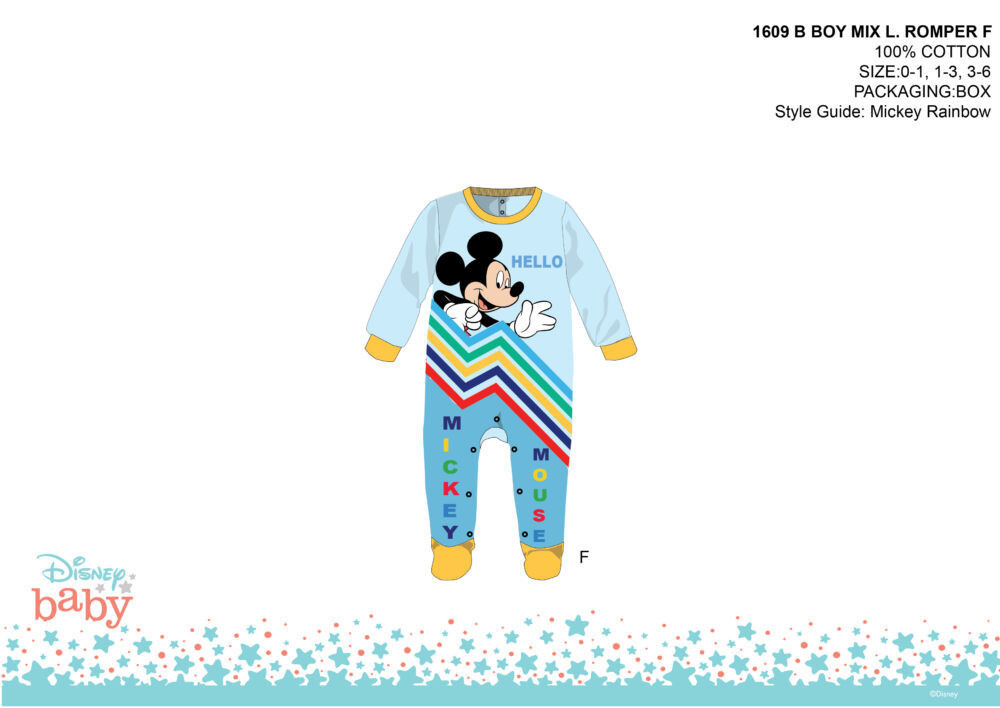 Anyagösszetétel pamutMéret 0-1 hónapos babánakMárka Mickey egérSzín világoskék-sárgaSzármazási ország CNTermék kategóriája PizsamaTermék típus PizsamaKinek ajánljuk UnisexEAN 5949082516830VTSZ 63079098Anyaga pamutSKU MIXBOY1609_vke-sar_0-1Jótállás (hónap) 24
